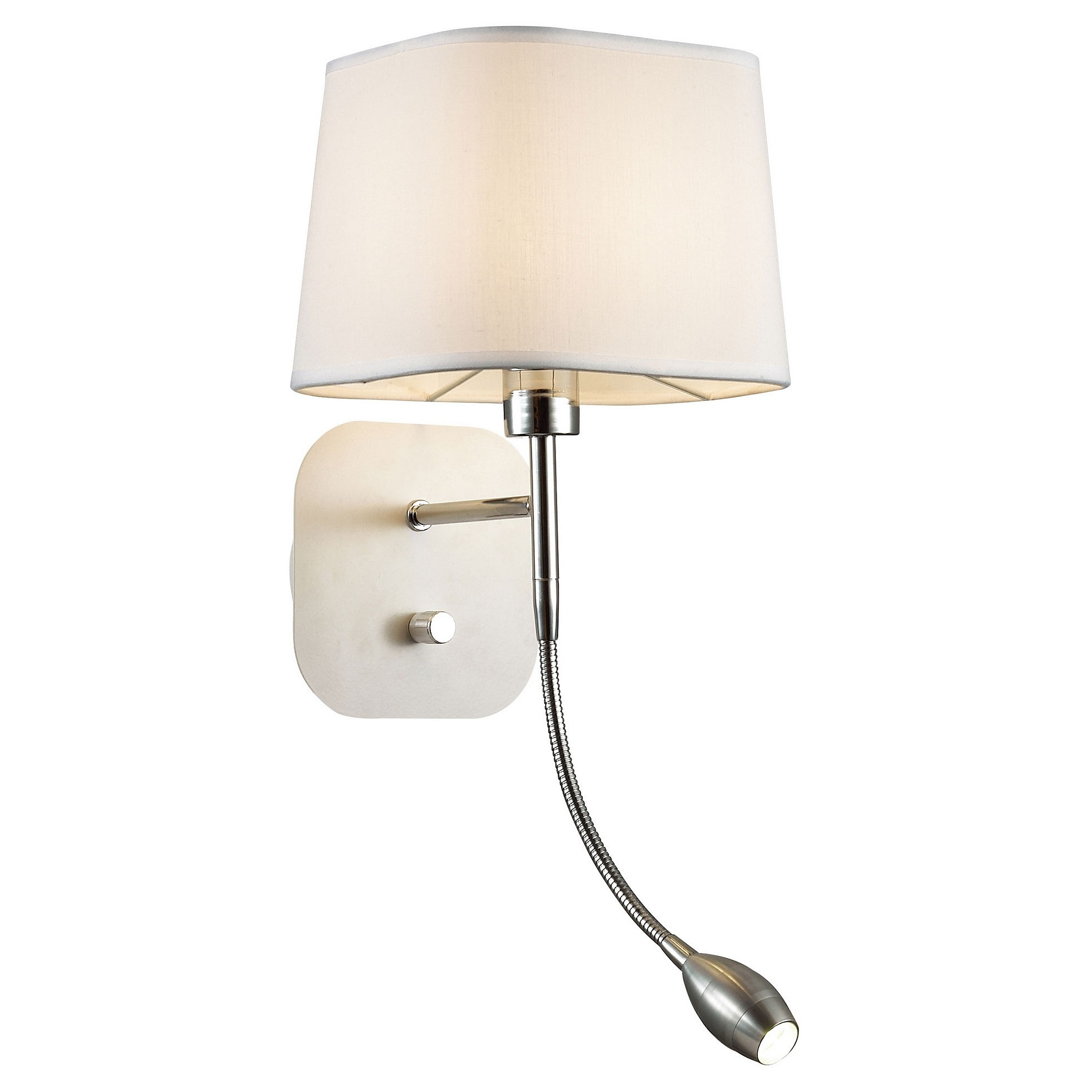 Металлический каркас белого цвета, плафон из ткани белого, два источника света, два выключателя. Светильник Baumwolle является воплощением эстетичности, легкости и функциональности. Белый тканевый абажур создает мягкий свет, гибкое основание маленького плафона направленного света обеспечивает функциональность светильника, повышая его удобство и комфорт для использования.
