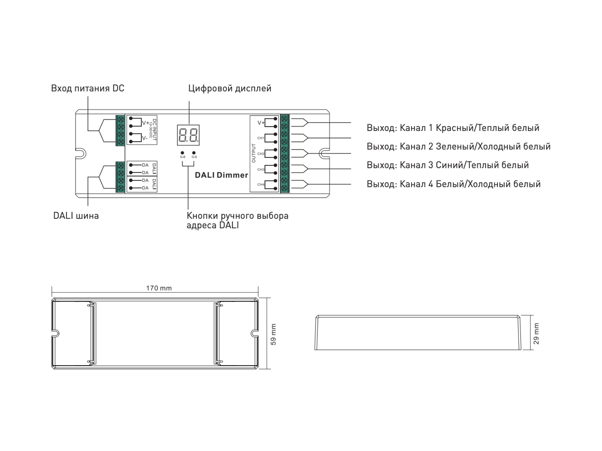 | Альтернативное название | Dali диммер универсальный для лент 4х8А, DALI-DT6-GR4 00-00013177, DALI-DT6-GR4, EasyDim |