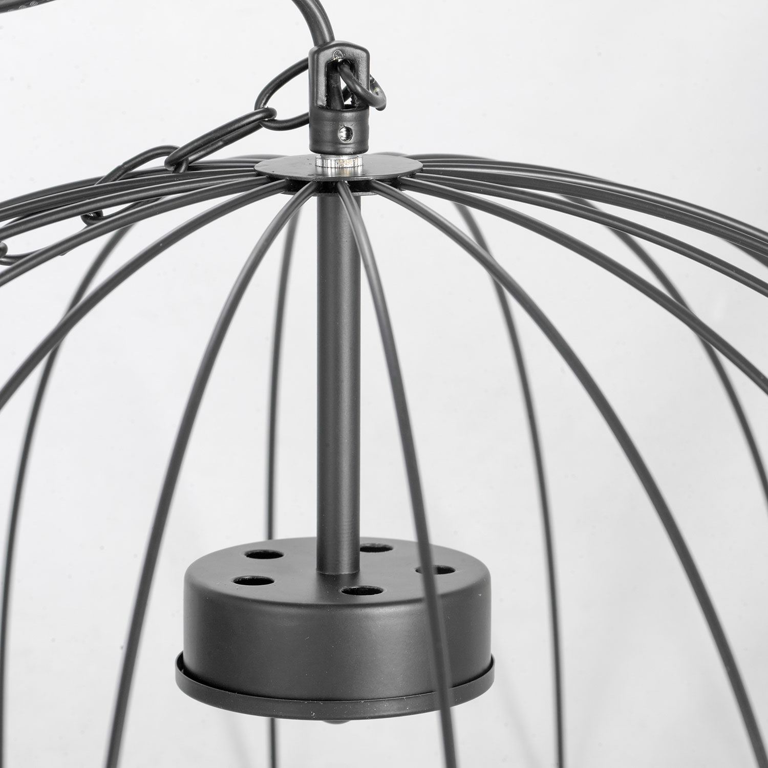 Черный каркас плюс черная цепь. Как и положено в лучших традициях производителей красоты, в дополнение к младшей модели есть и старшая. Младшая - это потолочная люстра на три лампы, старшая это подвесная, на цепи, на пять ламп.