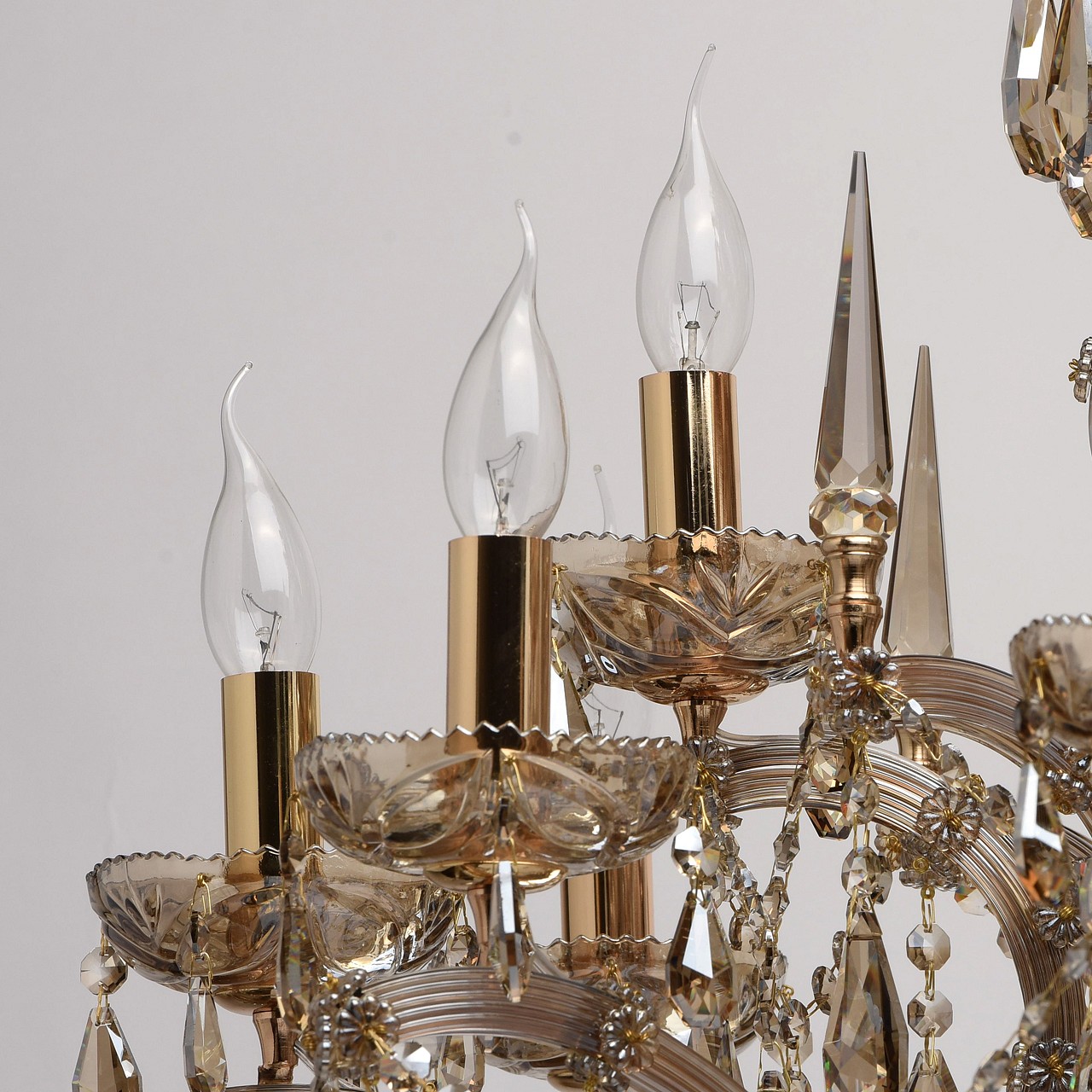регулируется по высоте Классический парадный стиль, продуманные детали, благородные тона – все это в светильниках из коллекции «Одетта». Металлическое основание яркого золотого оттенка эффектно подчеркнуто источниками света в виде свеч и изящными рожками. На фоне драгоценных тонов прекрасно смотрятся хрустальные подвески цвета золотистого топаза. Стеклянный декор завершает композицию и придает ей дополнительное изящество.