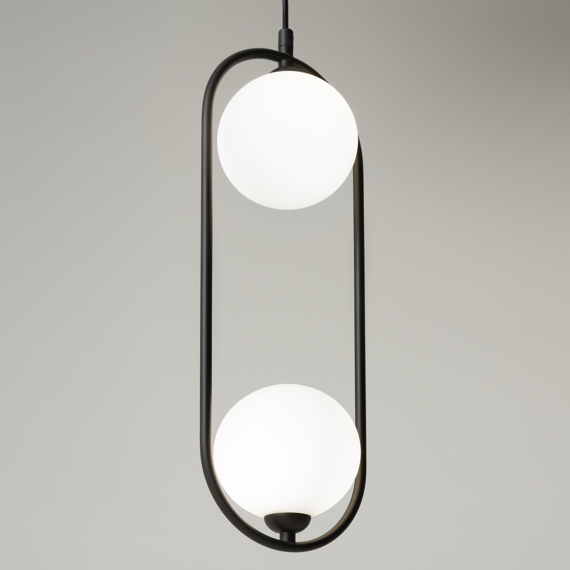 Арматура из металла в трех оттенках: белый, черный, латунь. Плафоны-сферы закреплены на округлом металлическом каркасе. Материал плафонов — выдувное стекло, цвет — белый. Высота подвесных моделей регулируется.