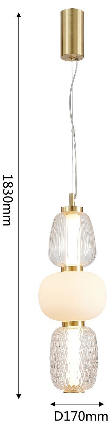 Металлический каркас цвета золота, плафоны в виде бусин разнообразных форм из выдувного стекла двух видов - прозрачного и цвета опала. Чередование стеклянных плафонов разной формы, цвета и рисунка, а также цветовое решение каркаса в золоте создает насыщенный сложный и дорогой образ. Плафоны из стекла выдуваются вручную