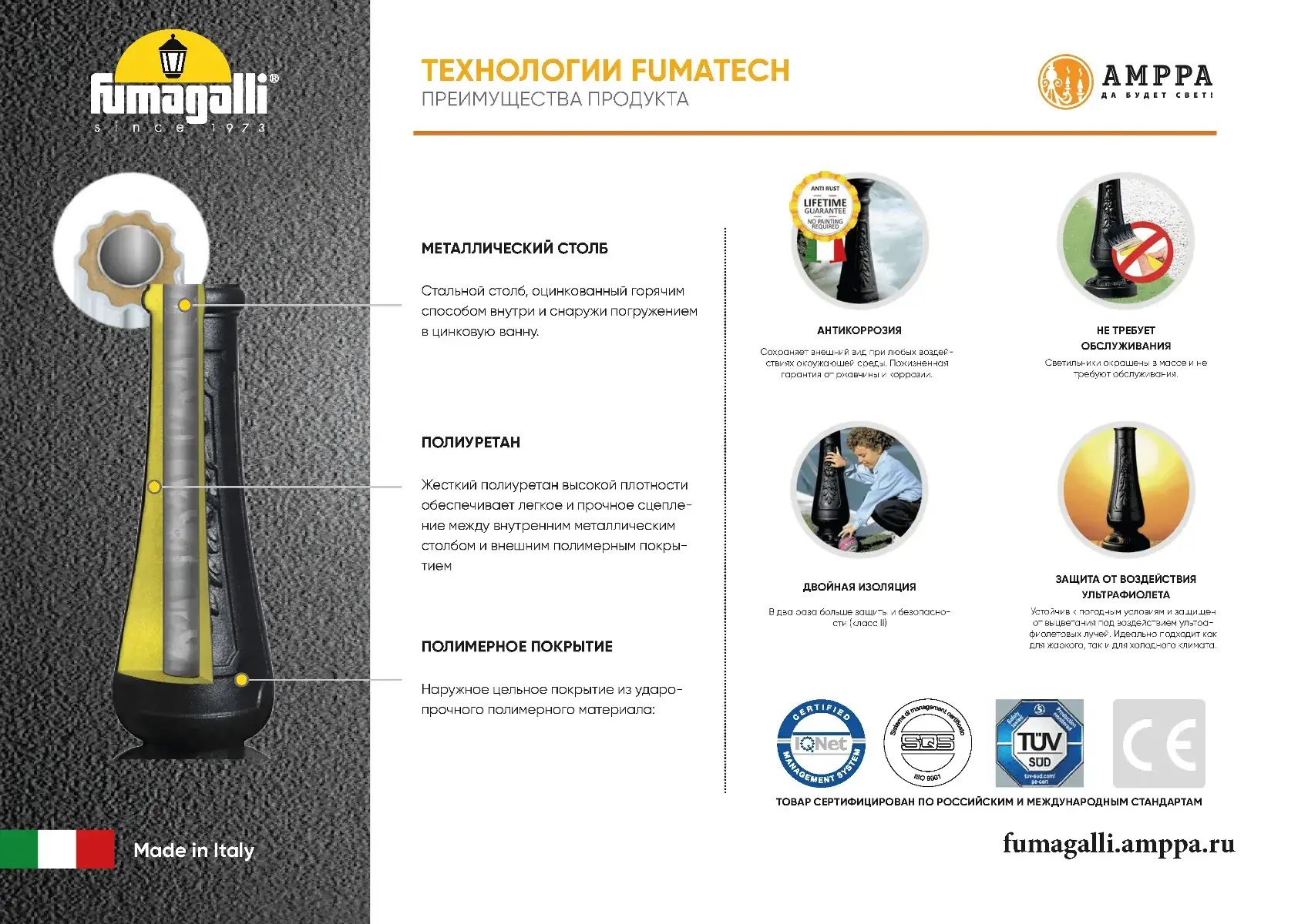 | Комплектация | С светодиодной лампой "FUMAGALLI" E27, 3000K. Специально для улицы, яркость 5000Lm. С защитой от перепадов температуры, повышенной влажности и скачков напряжения. |